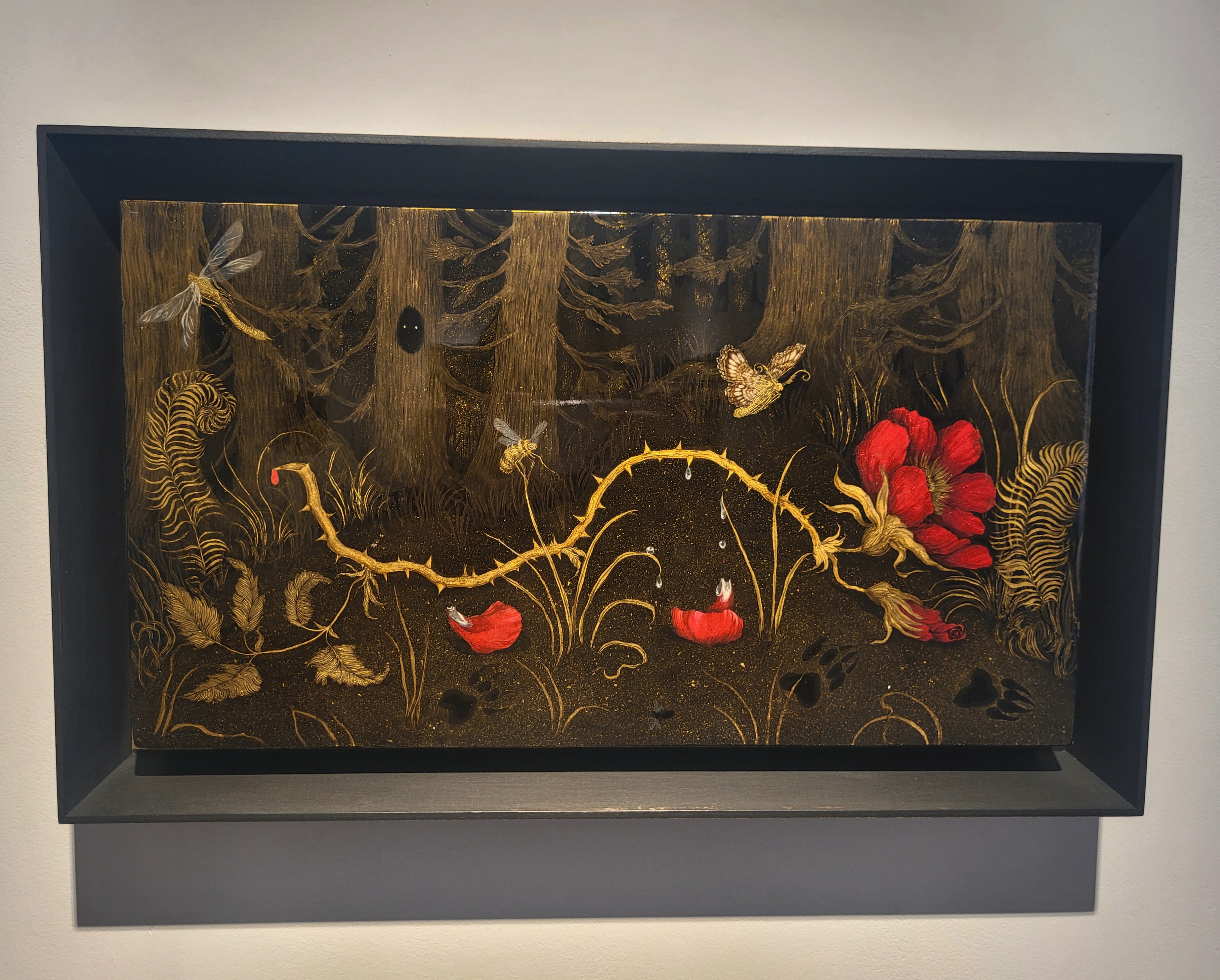 We see intricate details of the forest floor, such as the golden flora and fauna. In addition to lacquer, Riddell uses materials such as gold and silver leaf as well as mother of pearl when adding the painstaking details to her work.